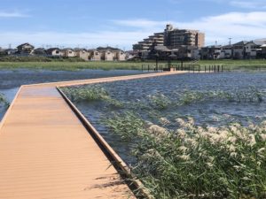 お魚キラーやカメ網を仕掛けて、調整池の生き物を採取します。