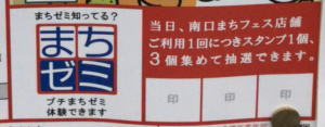 当日は、南口まちフェス店舗利用でもらえるスタンプを3個集めると抽選会に参加できるようですよ。